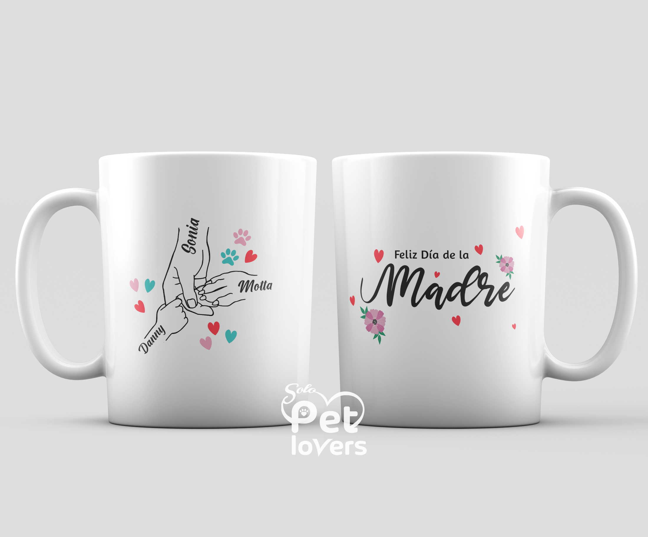 Taza Personalizada Mami Doglover – Manos y patita. Incluye el nombre de la mamá petlover, el nombre de su hijo o hija y el nombre de su perrhijo.