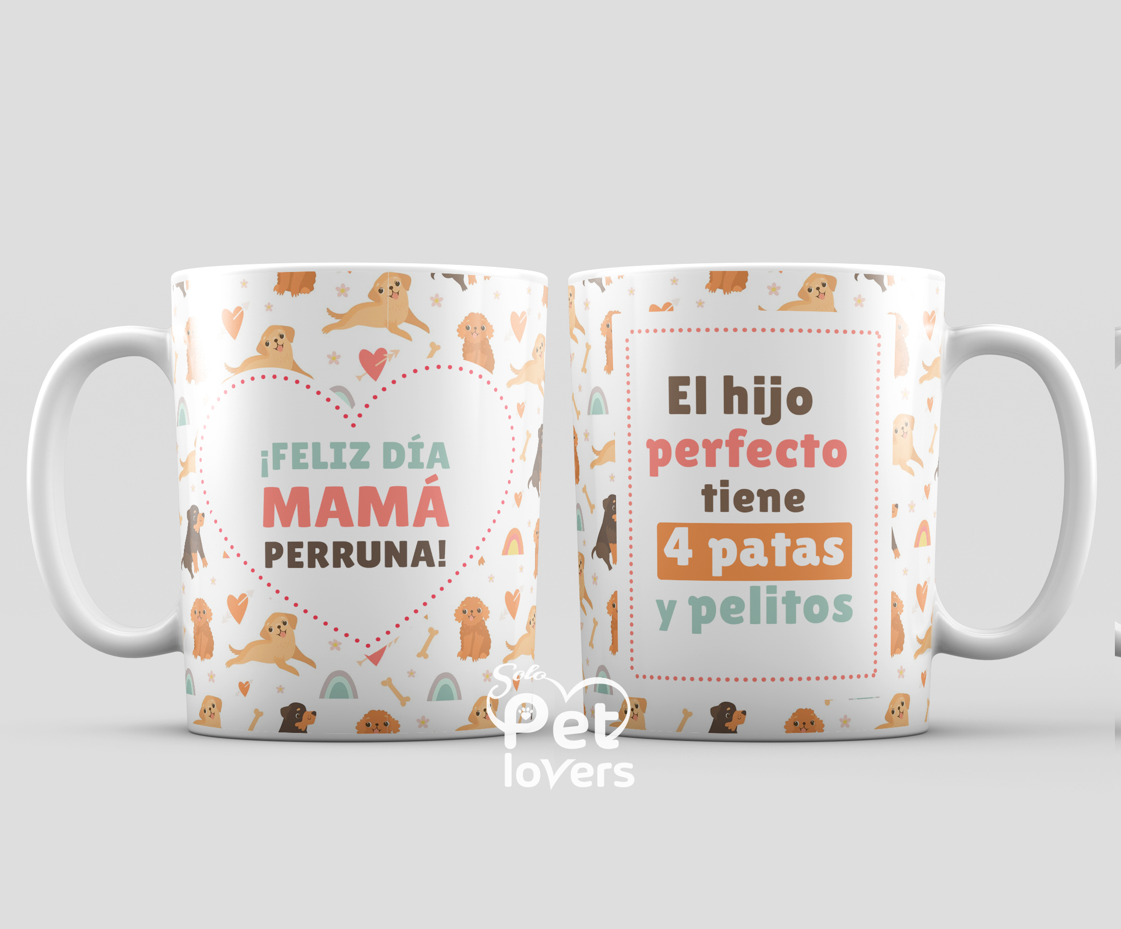 Este diseño de taza Doglover incluye por un lado la frase: «Feliz día mamá perruna»; y al reverso la frase: «El hijo perfecto tiene 4 patas y pelitos».